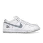The Nike SB Dunk Low Supreme 94 White Metallic Silver EU48.5-US14-UK13 is an exclusive collaboration between Nike SB and Supreme, featuring a sleek white leather upper and a striking, reflective silver Swoosh. The sneaker is a sought-after collector's item and is known for its premium materials and subtle branding.